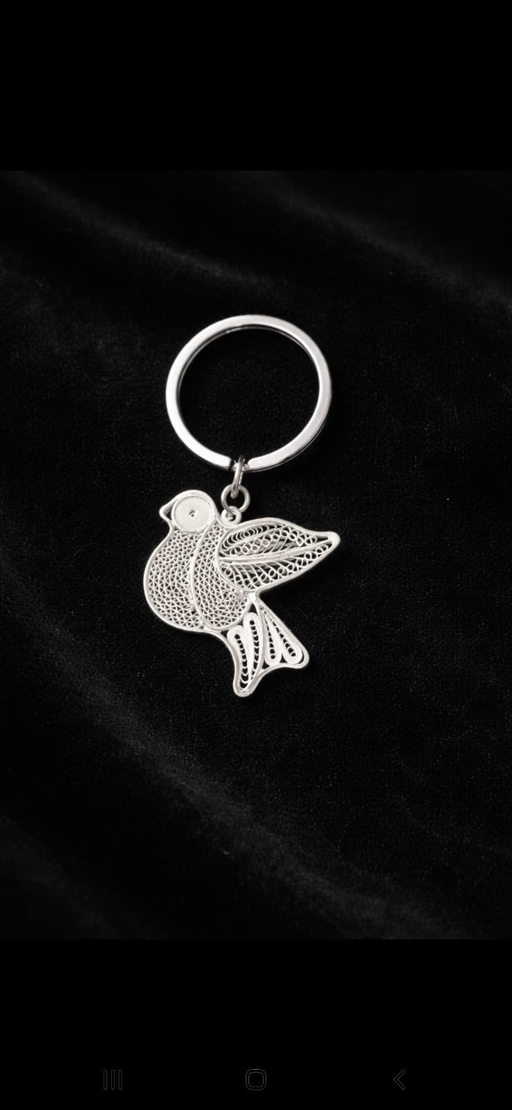 Symbolising peace, hope, and harmony, this silver dove design filigree key chain is a meaningful accessory crafted with delicate artistry. The beautifully detailed dove motif is handcrafted using traditional fine wire filigree technique, creating an intricate lace-like pattern that enhances its elegance and depth.